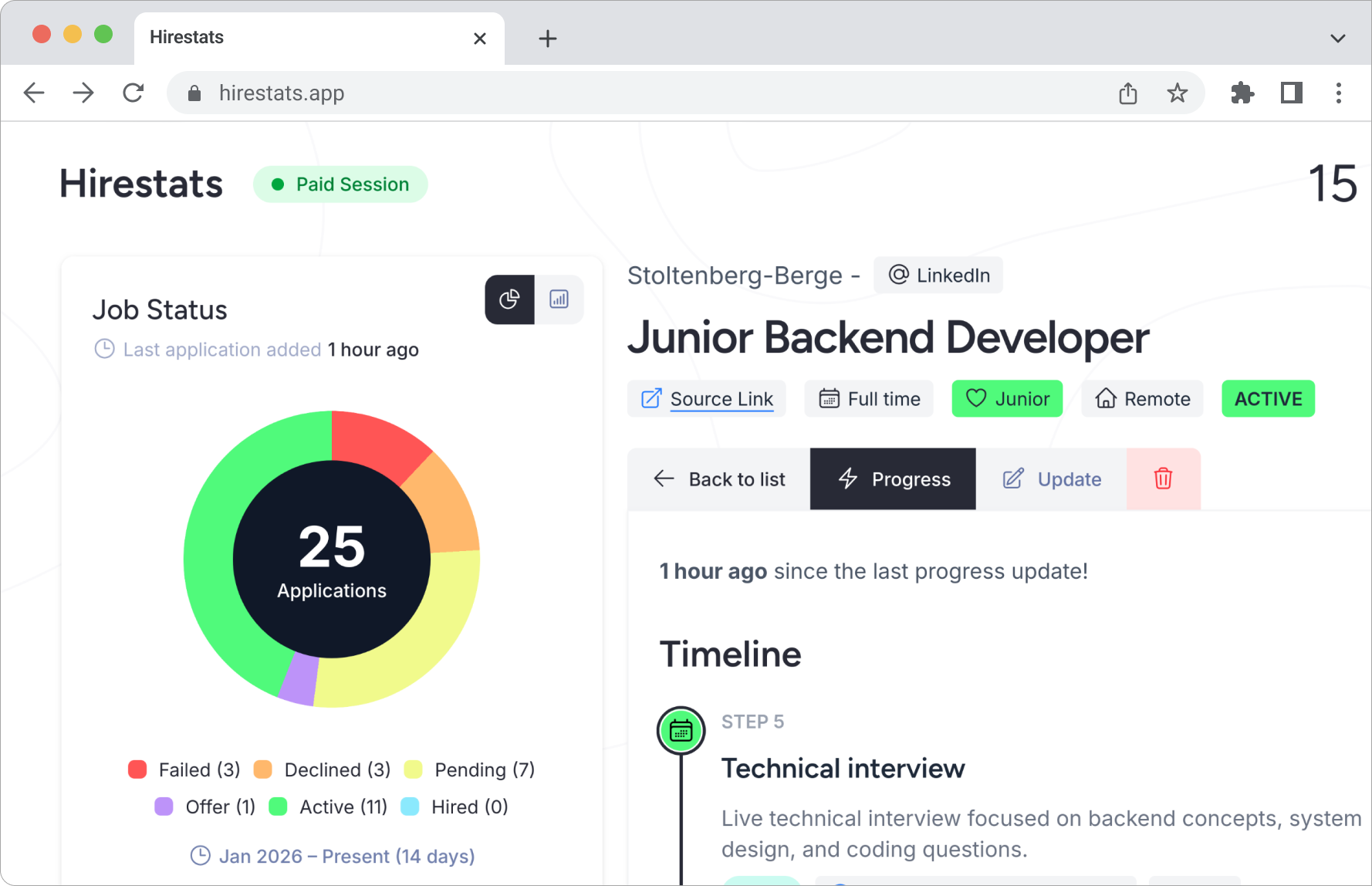 Hirestats keeps your job search organized, focused, and on track — from application to offer.